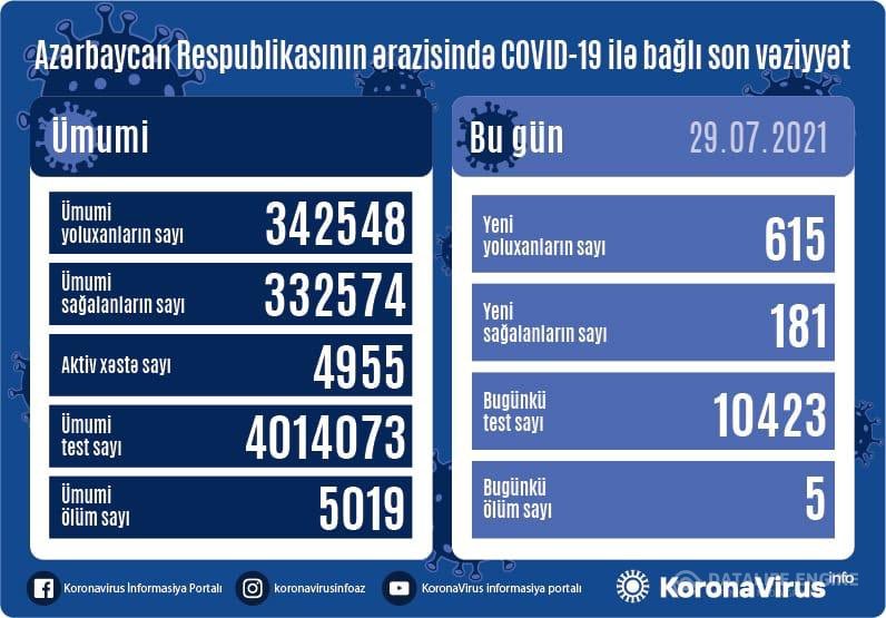Azərbaycanda bu gün koronavirus infeksiyasına 615 yeni yoluxma faktı qeydə alınıb, 181 nəfər müalicə olunaraq sağalıb və evə buraxılıb.