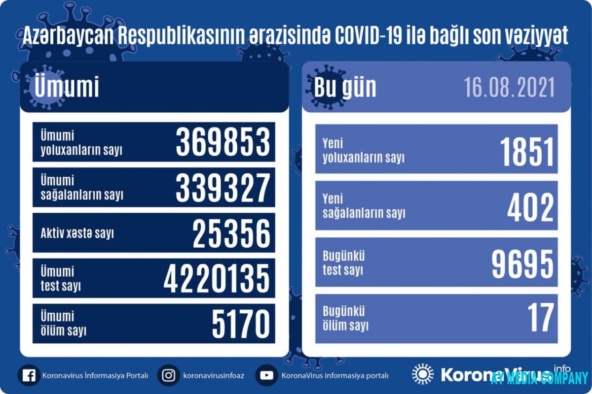Azərbaycan Respublikasında koronavirus (COVID-19) infeksiyasına 1 851 yeni yoluxma faktı qeydə alınıb, 402 nəfər müalicə olunaraq sağalıb.