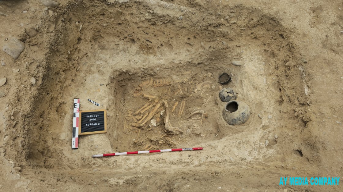 İkinci istiqamət isə Sarısoy kurqanlarıdır. Sarısoy istiqamətində aparılmış arxeoloji qazıntı işləri başa çatdırılıb və maraqlı tapıntılar əldə olunub. Kurqanlar özündə Xocalı-Gədəbəy mədəniyyətinin izlərini yaşadır və bu mədəniyyəti öyrənmək üçün mühüm əhəmiyyət kəsb edən dəfn adətləri mövcuddur. Maraqlı məqam ondan ibarətdir ki, kurqanın çox kiçik - uzunluğu təxminən 1,5 metr, eni 1 metr olan kamera hissəsi var. Kurqanın örtüyü 12 metr, hündürlüyü 1 metrdən azdır. Kameranı tədqiq edərkən 3 ədəd saxsı küp aşkar olunub. Qəbir kamerası şimal-qərb, cənub-şərq istiqamətində qurulub və bir nəfər dəfn olunub. Skeletin üzü cənub-qərbə doğrudur, sağ böyrü üstə və bükülü vəziyyətdədir. Maraqlı cəhətlərdən biri də odur ki, skeletin ön hissəsində kamera boyunca cavan və kiçik yaşında olan ev heyvanı dəfn olunub. Paleontoloqlar tərəfindən baxıldıqdan sonra bu heyvanın kiçik və ya iribuynuzlu olduğu barədə məlumat verilə bilər. Skeletin arxa hissəsi boyunca kiçikbuynuzlu ev heyvanı dəfn olunub ki, bu da böyük ehtimalla keçi və ya qoyundur. Ancaq çox böyük ehtimalla keçidir. Qəbir kamerasında əlavə 10 santimetr də olsa, boş yer yoxdur. İnsan və heyvan sümüklərinin düzümündən sonra kamerada boş yer qalmayıb. Bu da arxeoloji cəhətdən böyük əhəmiyyət kəsb edir və belə qəbir abidələrinin tədqiqi Xocalı-Gədəbəy mədəniyyətində tayfaların dəfn adətlərini, dünyagörüşünü öyrənmək üçün mühüm rol oynayır.