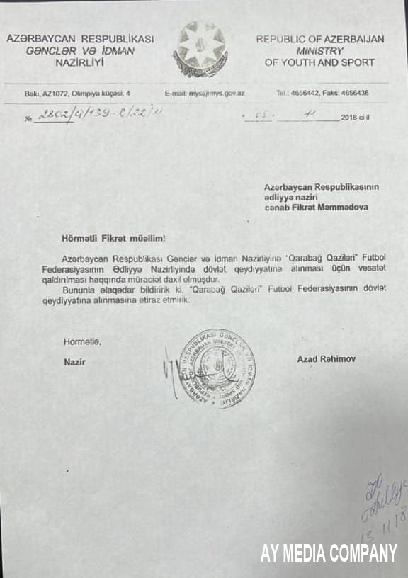 - Nəzərinizə çatdırıram ki, mən Yeni Azərbaycan Partiyasının üzvüyəm, ömrü boyu da haqq-ədalət tərəfdarı olmuşam.Yaranan anlaşılmazlığla bağlı hər iki quruma (ANAMA və AFFA-ya) müraciət etmişəm. Hətta Ədliyyə Nazirliyinindən qeydiyyatdan keçmiş sənədləri AFFA-nın baş katibi Sərxan Hacıyevə təqdim edərək dedim ki, kimi istəyirsiniz QƏDFF-na rəhbər təyin edin, amma Federasiyanın son 5 ildə qazandığı nailiyyətlərinə və tarixinə toxunmayın. Diqqətinizə çatdırmaq istərdim ki, Azərbaycan Respublikası Gənclər və İdman Nazirliyi 2018-ci ildə mənə məktub verərək Federasiyanın Ədliyyə Nazirliyində qeydiyyatdan keçməsinə etiraz etməmişdir. İnanıram ki, haqq-ədalət öz yerini tutacaq. Biz də QƏDFF-sı olaraq Ali Baş Komandan Prezident İlham Əliyevin tövsiyyələrinə əməl etməklə dövlət suverenliyi tam bərpa olan Azərbaycanımıza xidmət edəcəyik.