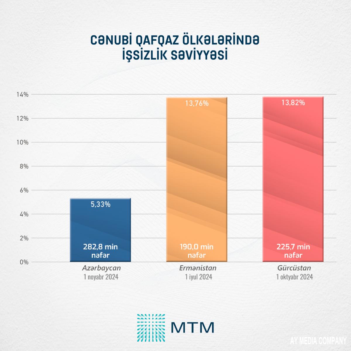 Ermənistanda 1 iyul 2024-cü il tarixinə olan məlumata əsasən, işsizlik səviyyəsi 13,76%-ə (190 min nəfər), Gürcüstanda isə 1 oktyabr 2024-cü il tarixinə olan göstəriciyə əsasən, 13,82%-ə (225,7 min nəfər) bərabər olub.