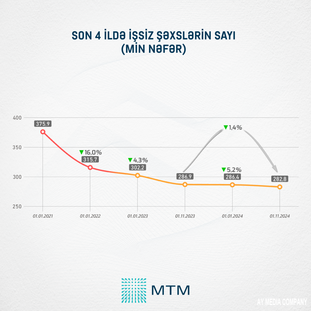 1 noyabr 2024-cü il tarixinə ölkədəki işsiz şəxslərin sayı 282,8 min nəfər təşkil edib ki, bu da son bir ildə işsiz şəxslərin sayının 1,4% azalması deməkdir.
