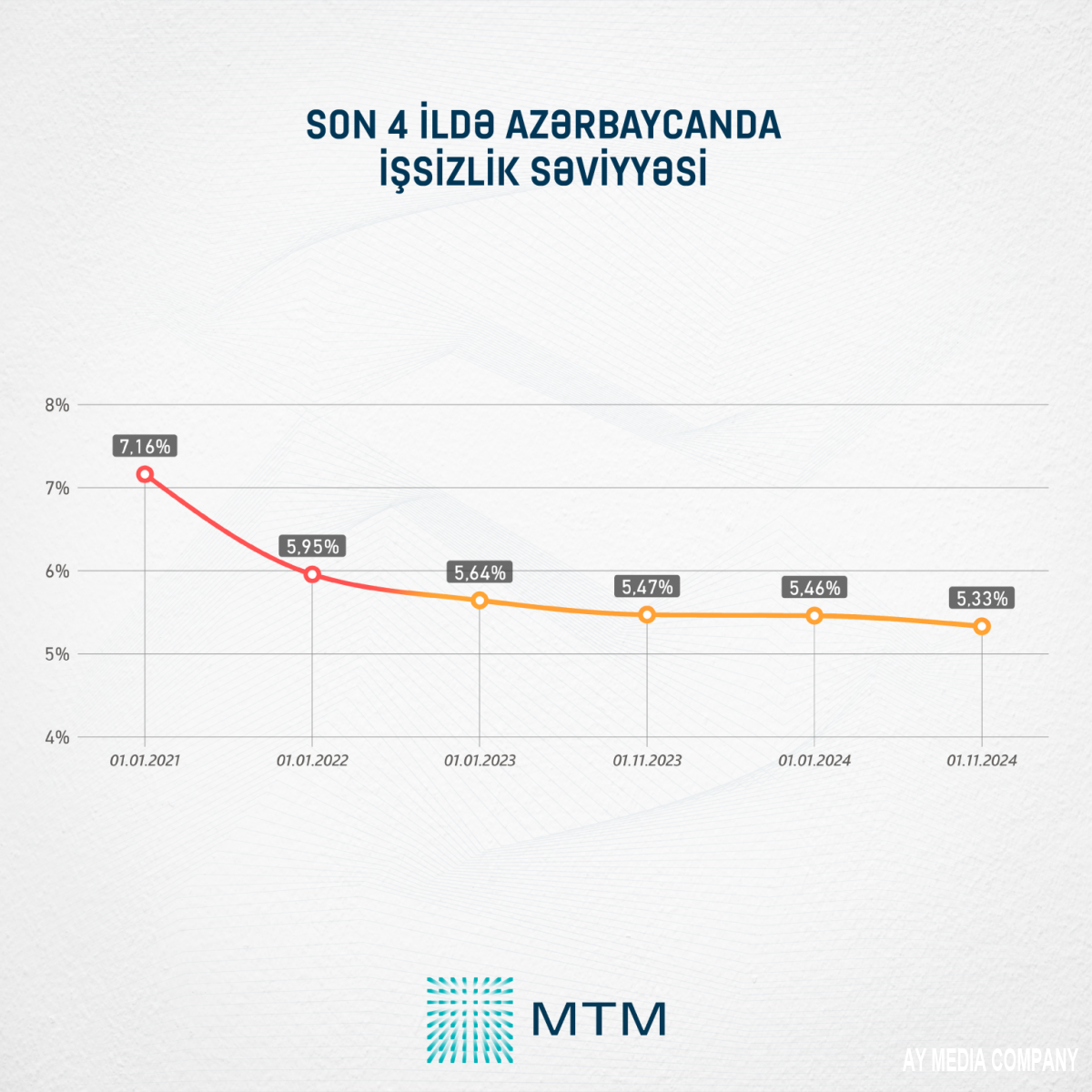 Cari ilin əvvəlində Azərbaycanda işsizlik səviyyəsi 5,46%-ə bərabər idisə, noyabrın 1-nə olan göstəriciyə görə, bu rəqəm 5,33%-ə düşüb. Son 4 ilin rəqəmləri göstərir ki, Azərbaycanda işsizlik səviyyəsi hər ötən il daha da azalır.