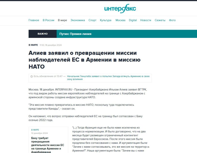 “İnterfaks” agentliyi Prezident İlham Əliyevin Ermənistandakı Avropa İttifaqı müşahidəçilərinin NATO missiyasına çevrilməsi barədə fikirlərini sitat gətirib. Bildirilir ki, Azərbaycan Lideri “Avropa müşahidəçiləri” pərdəsi altında Ermənistan sərhədində NATO tərəfindən infrastruktur yaradıldığını diqqətə çatdırıb. Bundan əlavə, agentlik Azərbaycan Prezidentinin Ermənistanın Fransa, Hindistan və ABŞ tərəfindən silahlandırılması məsələsinə də münasibət bildirdiyini yazıb.