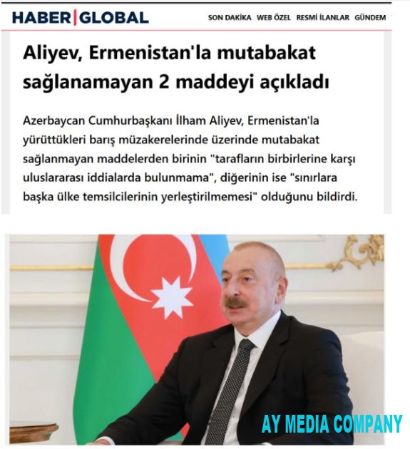 “HaberGlobal” telekanalının saytında yayımlanan yazıda dövlətimizin başçısının Ermənistanla sülh danışıqlarında razılaşdırılmayan iki bəndin qaldığını, bunların “tərəflərin bir-birinə qarşı beynəlxalq iddialar irəli sürməməsi” və “sərhədlərdə başqa dövlətlərin nümayəndələrinin yerləşdirməməsi” olduğunu bəyan etdiyi diqqətə çatdırılıb.