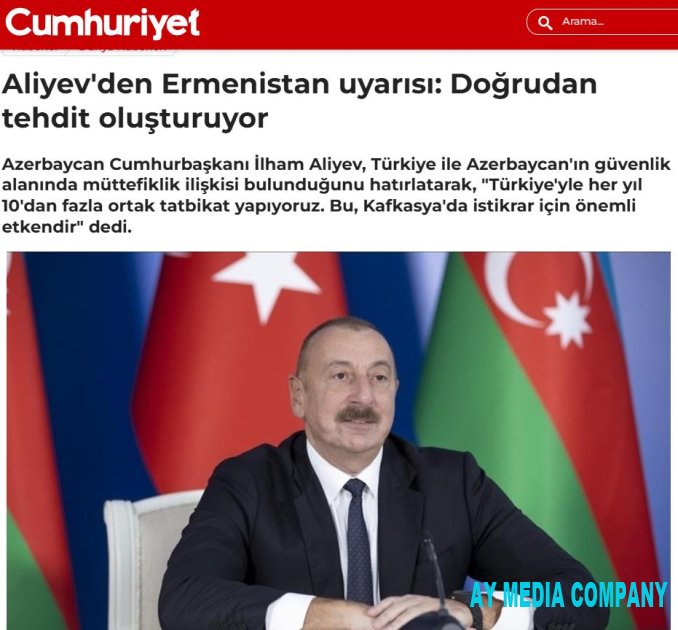 Türkiyənin Anadolu Agentliyinin, “Cumhuriyet” qəzetinin, “BengüTürk” telekanalının xəbərlərində vurğulanır ki, Prezident İlham Əliyev müsahibəsində Türkiyə ilə Azərbaycan arasında təhlükəsizlik sahəsində müttəfiqlik münasibətlərindən bəhs edərək, hər il ölkələrimizin 10-dan çox birgə təlim keçirdiyini, bunun Qafqazda sabitlik üçün mühüm amil olduğunu bildirib.