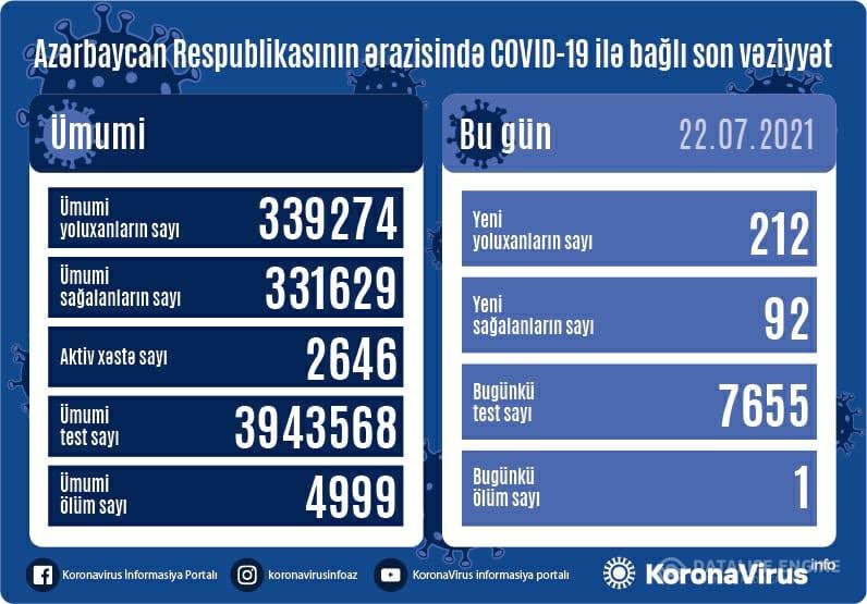 Azərbaycanda bu gün koronavirus infeksiyasına 212 yeni yoluxma faktı qeydə alınıb, 92 nəfər müalicə olunaraq sağalıb və evə buraxılıb.