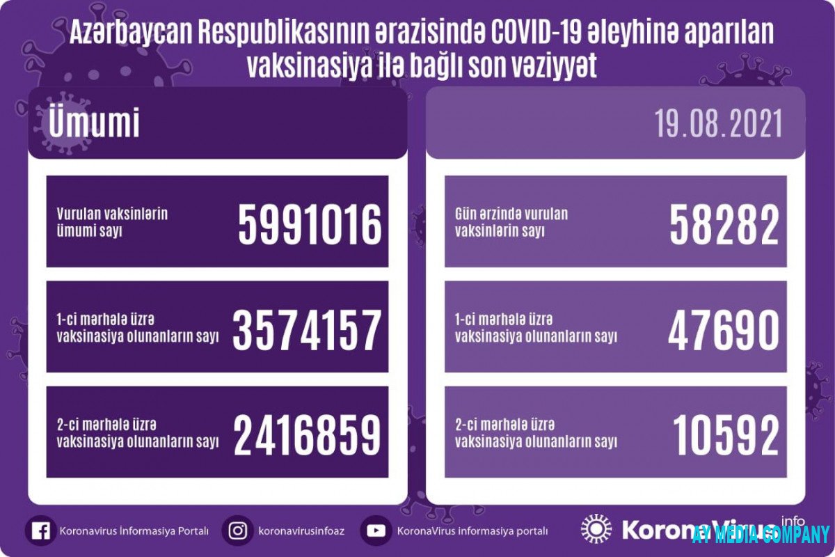 Qeyd edək ki, ölkədə vurulan vaksinlərin ümumi sayı 5 991 016, birinci mərhələ üzrə vaksinasiya olunanların ümumi sayı 3 574 157, ikinci mərhələ üzrə vaksinasiya olunanların sayı isə 2 416 859 təşkil edir.