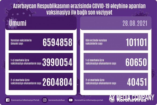Ölkədə vurulan peyvəndlərin ümumi sayı 6 594 858, birinci mərhələ üzrə vaksin olunanların sayı 3 990 054, ikinci mərhələ üzrə isə 2 604 804 nəfər təşkil edir.