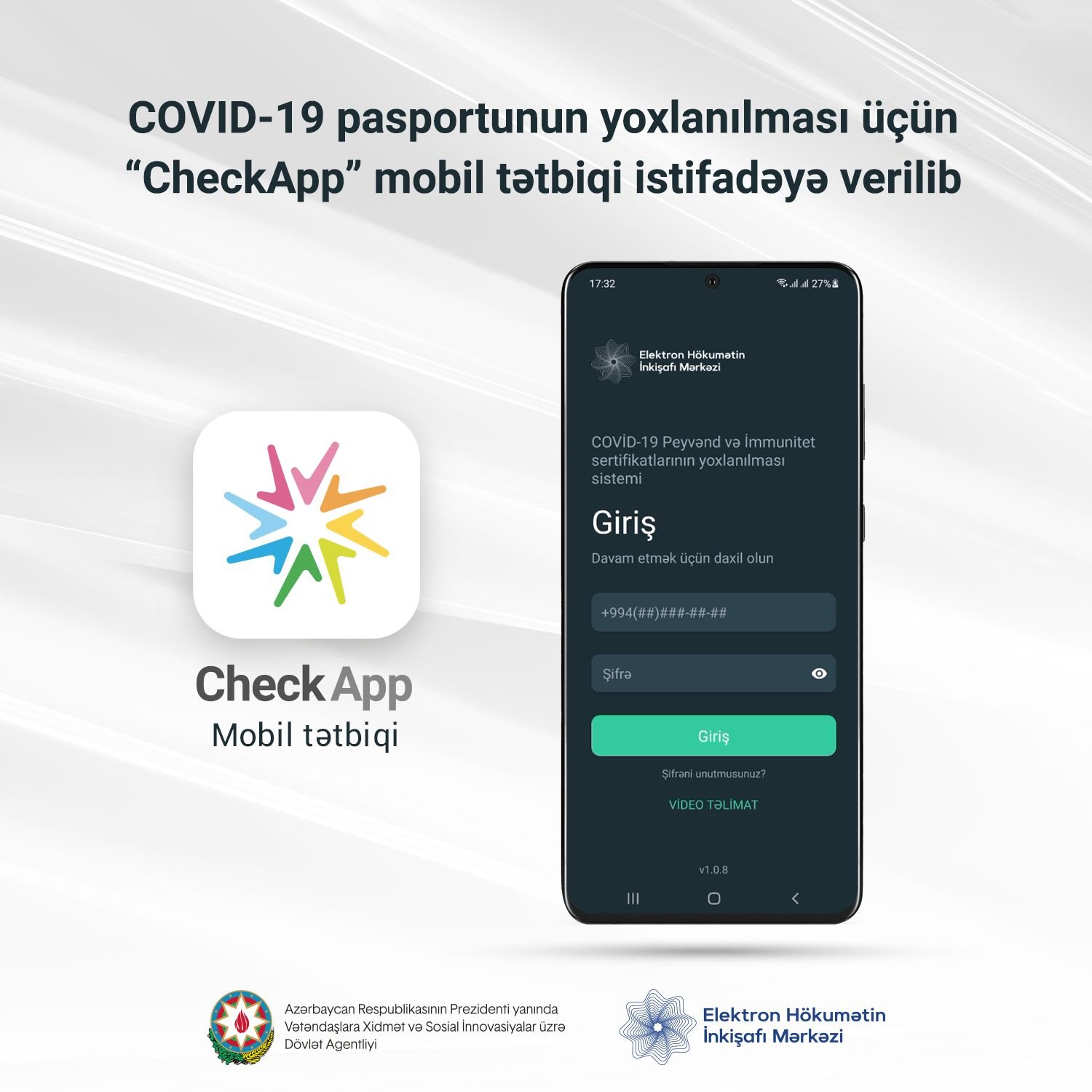 Azərbaycan Respublikasının Prezidenti yanında Vətəndaşlara Xidmət və Sosial İnnovasiyalar üzrə Dövlət Agentliyinin Elektron Hökumətin İnkişafı Mərkəzi (EHİM) tərəfindən “CheckApp” mobil tətbiqi istifadəyə verilib. Tətbiq Azərbaycan Respublikası Nazirlər Kabinetinin Qərarı ilə nəzərdə tutulan qurum və müəssisələrdə COVID-19 pasportlarının yoxlanılması məqsədilə yaradılıb.