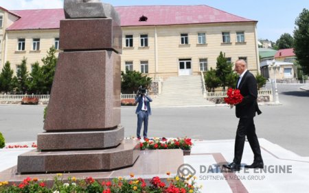 Dövlətimizin başçısı əvvəlcə ulu öndər Heydər Əliyevin şəhərin mərkəzində ucaldılan abidəsini ziyarət edib, önünə gül dəstəsi qoyub.