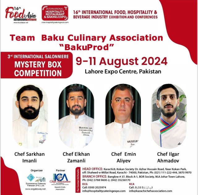 Bakı Kulinariya Assosiasiyasının aşpazlar komandası avqustun 9-dan 11-dək Pakistanın Lahor şəhərində keçirilən 3-cü “Salonniere Mystery Box” beynəlxalq müsabiqəsində ölkəmizi uğurla təmsil edib. Müsabiqə 16-cı Pakistan Beynəlxalq Qida Sənayesi Sərgisi çərçivəsində təşkil olunub.