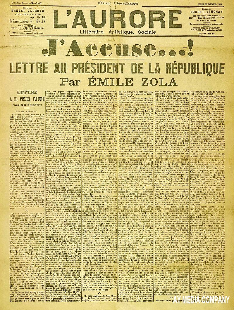 Dünya hüquq tarixinə düşən Fransadakı "Dreyfus məhkəməsi" 1895-ci ilin 5 yanvarında sona çatdı. Məhkəmə Almaniya üçün casusluq etməkdə günahlandırılan yüzbaşı Alfred Dreyfusu ömürlük həbsə məhkum etdi. Rütbələri sökülən Dreyfus həbsxanaya göndərildi. Onun günahsız olduğuna inanan yazıçı Emile Zola dövrün Fransa başçısına xitabən "Günahlandırıram" başlıqlı açıq məktub yazdı. Bununla mövzu gündəmə gəldi, məhkəmə işi yenidən müzakirə olundu və 8 il sonra Dreyfusun bəraəti ilə nəticələndi. “Legion d'honneur” medalı sahibi Alfred Dreyfus minbaşı (mayor) rütbəsi alaraq yenidən Fransa ordusuna qayıtdı.
