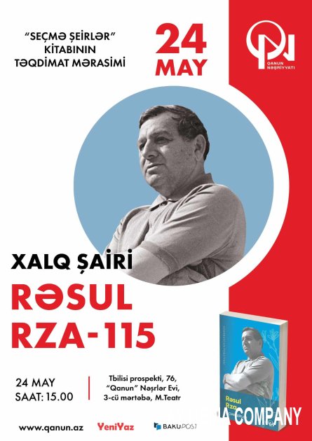 Mayın 24-də “Qanun” nəşriyyatında Xalq şairi Rəsul Rzanın yeni çapdan çıxmış “Azərbaycan poeziyası. Seçmə şeirlər” kitabının təqdimatı keçiriləcək.