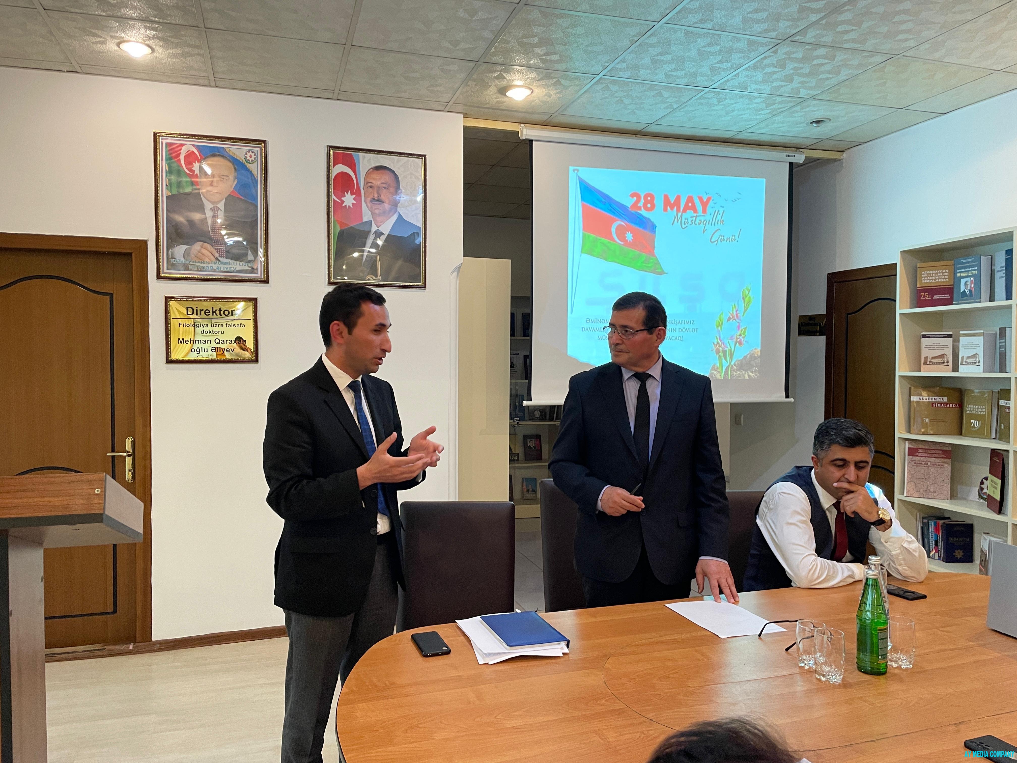 Tədbiri giriş sözü ilə açan Mərkəzin direktoru Mehman Qaraxan oğlu Əliyev bildirib ki, 1918-ci il may ayının 28-də Tiflisdə müsəlman Şərqində ilk demokratik, hüquqi və dünyəvi dövlət olan Azərbaycan Xalq Cümhuriyyətinin elan edilməsi azərbaycanlıların, ilk növbədə, yüksək milli ideyaya və yenilikçi düşüncə tərzinə malik olmasının bariz göstəricisidir. Milli dövlətçilik tariximizdə məhz AXC dövründə xalqın demokratik hüquq və azadlıqları bərqərar edilmiş, müsəlman dünyasında ilk dəfə qadınların seçki hüququ tanınmış, etnik və dini mənsubiyyətindən asılı olmayaraq, bütün vətəndaşlar bərabər hüquqlara yiyələnmiş, Milli Ordu, parlament, hüquq-mühafizə orqanları, ən nəhayət, ilk ali təhsil müəssisəsi olan indiki Bakı Dövlət Universiteti yaradılmışdır.