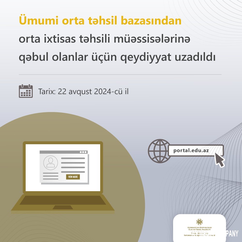 28 avqust saat 11:00-da ali təhsil müəssisələrinə bakalavriat səviyyəsi üzrə qəbul olunanlar üçün qeydiyyat prosesinə start veriləcək. Abituriyentlər https://portal.edu.az/ platformasında “Ali və orta ixtisas təhsili pilləsinə təhsilalan qeydiyyatı” xidmətini seçməklə müraciət edə bilərlər. Açılan səhifədə şəxsi və qəbul məlumatlarının təsdiqi, həmçinin tələb olunan sənədlərin əlavə edilməsi mümkündür.